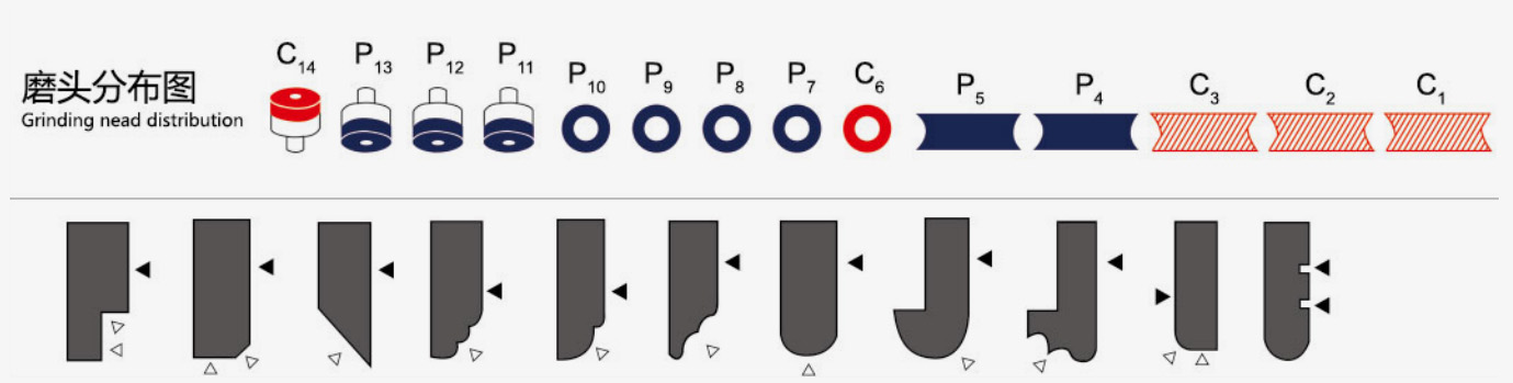 該機(jī)1號(hào)至5號(hào)可配置直經(jīng)20cm磨輪,根據(jù)石材不同尺寸,厚度磨削各種平板石材的大小圓邊、法國(guó)造、直線底邊45°倒角、開槽拉光、鴨嘴邊、海棠角、背切等各種異形邊,拋光磨輪消耗后,磨輪可在運(yùn)行過程中自動(dòng)補(bǔ)償,無須手動(dòng)調(diào)節(jié),6號(hào)至13號(hào)磨輪采用水磨片,配置鍋??劢宇^,手動(dòng)調(diào)節(jié)電機(jī)前后移動(dòng),升降,可磨削各種平板石材的直角底邊、加厚直邊見光,直線底邊45°倒角、直邊成型,海棠角背切(第一個(gè)可配置300-350mm鋸片用于背切,背切與側(cè)面拋光可一次完成)、磨光、粗磨、精磨、拋光工序一次完成,加工后亮度高于板面亮度,該機(jī)結(jié)構(gòu)先進(jìn)合理,精準(zhǔn)度高,效率快,操作方便,維護(hù)簡(jiǎn)單,在磨削過程中可調(diào)節(jié)進(jìn)料速度和進(jìn)行量,最大加工5m/分鐘,機(jī)械正營(yíng)使用相當(dāng)于正常石材加工15個(gè)人工作量,并杜絕出現(xiàn)工人加工時(shí)產(chǎn)生的工藝缺陷。